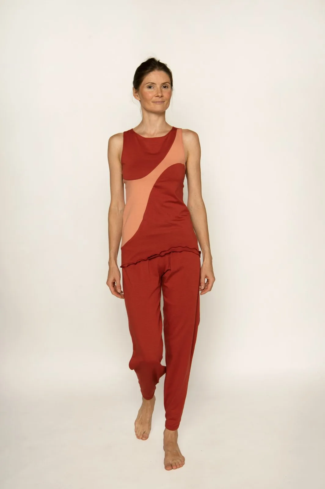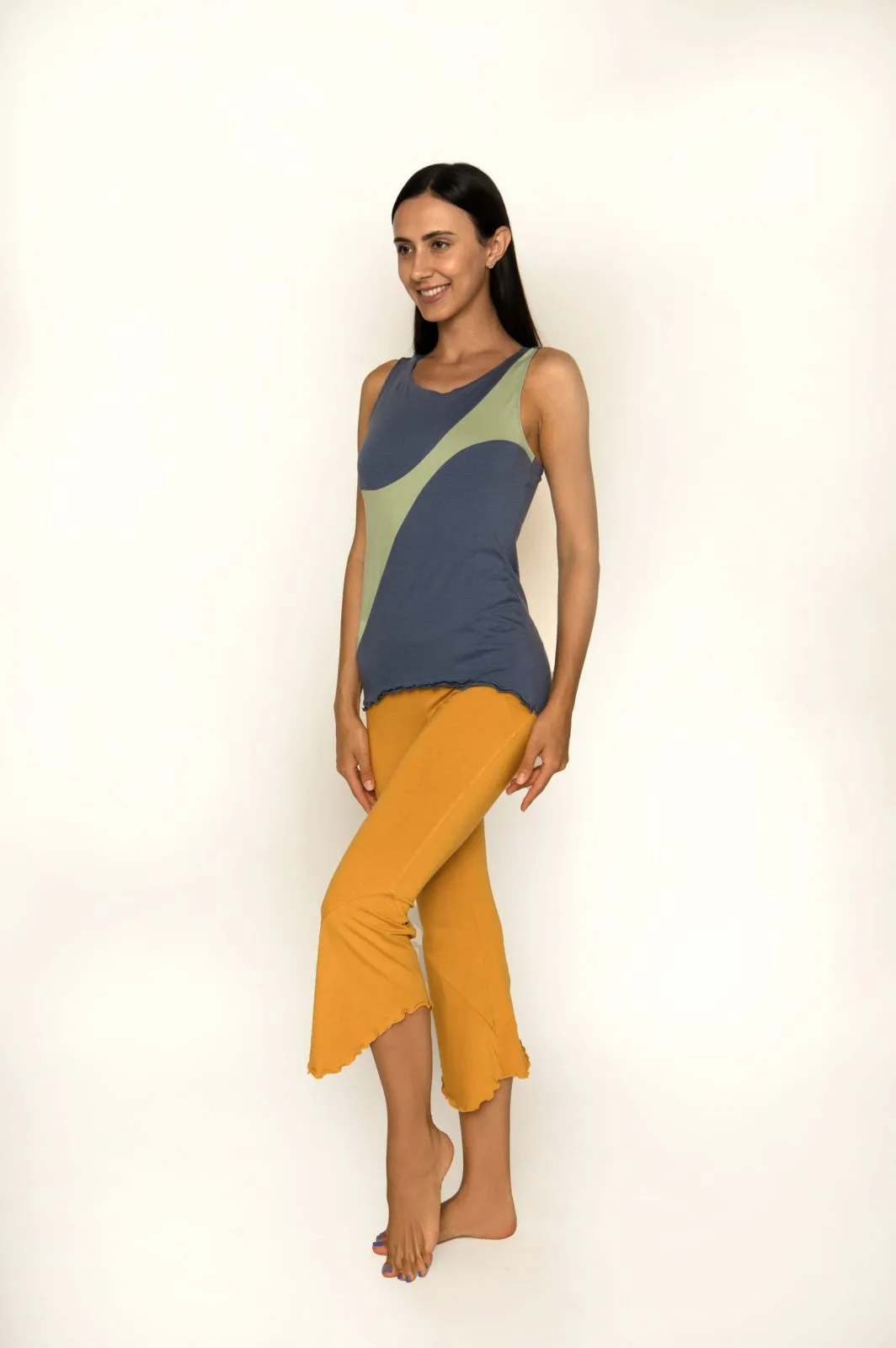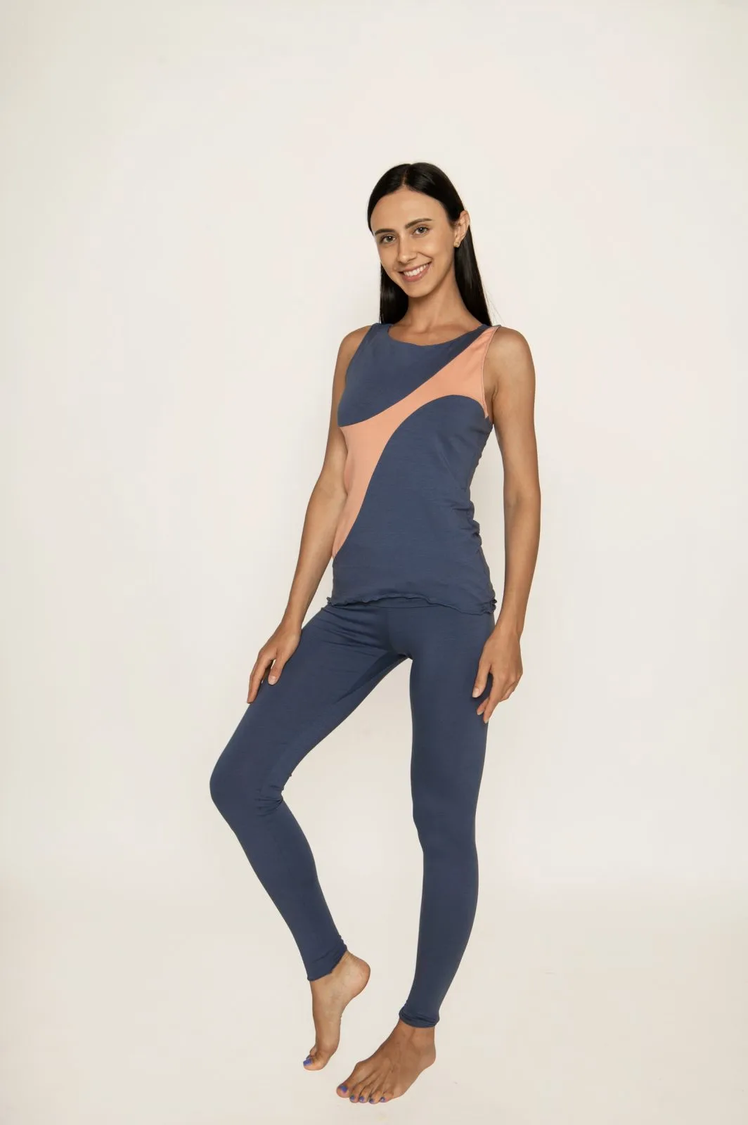 La maglietta yoga Onda è realizzata con due colori e riprende l’idea di movimento delle onde del mare, che si susseguono in un moto infinitamente perfetto. È una maglietta ottima per praticare yoga, fatta con tessuto di un morbido cotone organico, e ha una vestibilità avvolgente e confortevole.